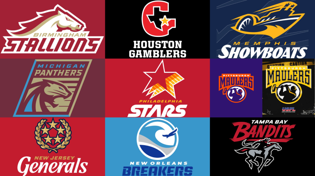 Los logos de la USFL en sus dos temporadas: Birmingham Stallions; Houston Gamblers; Memphis Showboats (2023); Michigan Panthers; Philadelphia Stars; Pittsburgh Maulers (2022 violeta y naranja/2023 negro y dorado); New Jersey Generals; New Orleans Breakers; Tampa Bay Bandits (2022) / Créditos: @USFL — Twitter/X