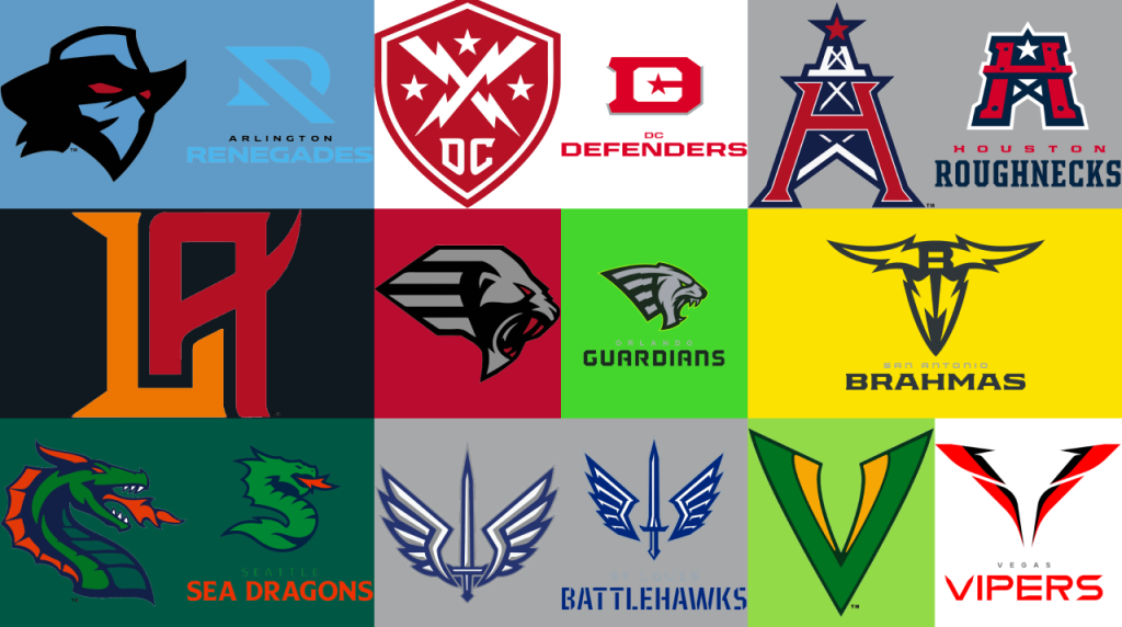 Los logos de la XFL, para los que tienen dos a la izquierda los de la temporada 2020 y a la derecha los de la temporada 2023: Dallas (2020)/Arlington (2023) Renegades; DC Defenders; Houston Roughnecks; LA Wildcats (2020); NY (2020)/Orlando (2023) Guardians; San Antonio Brahmas (2023); Seattle Dragons (2020)/Sea Dragons (2023); St. Louis Battlehawks; Tampa Bay (2020)/Vegas (2023) Vipers. / Créditos: Sportslogo.net — XFL
