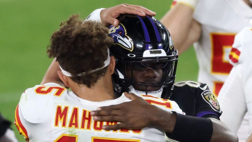 Lamar Jackson tiene un récord de 1-4 cuando se enfrenta a Patrick Mahomes y los Kansas City Chiefs (vía AP)